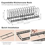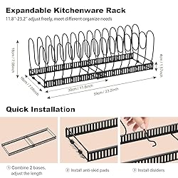 14 Adjustable Dividers: This pot lid organizer comes with 14 adjustable dividers, you can adjust the width according to the size of your pans or other cookware. Please Note: the max expandable overall size of this shelf is 23.2"D x 7.08"W x 7.08"H, check the size of your pot lids, pans and other cookware (especially the large size) before purchase, to ensure our rack fit your kitchenware. Please feel free to contact us if you have any questions. Expandable Pot and Pan Organizer: Designed as expandable for storage such as heavy pans, large platters, cutting board and other bakeware. It can be used on a countertop, cabinet and even under the sink. 2 DIY Methods: This pot rack has 2 DIY methods. You can use it as a expandable organizer or two separate pot lid racks. The length can easily expands from 12'' to 23'', which allows the flexibility to store in a pantry, cabinet, under the sink, or on countertop. Durable Material: Our pot and pan organizer rack is made of heavy duty iron, It's designed to hold even your heaviest cast iron pans. It is extremely robust and durable. Keep Your Countertop Tidy: Our pot organizer rack will help keep your pots, pans, lids, trays, plates, cookie sheets and cutting boards well organized and easy to reach.