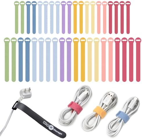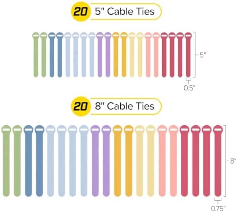 Self-Gripping Cable Ties by Wrap-It Storage, Macaron, 40 Pack (5 Inch and 8 Inch Straps) – Reusable Hook and Loop Cord Wraps for Home Office Desk Organization