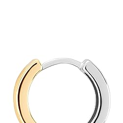 STYLE: Fine silver plated two-tone huggie hoop earrings are 17mm. Earrings have a click-top closure. MATERIAL: Hoop earrings are crafted in 14K gold over brass and fine silver plating over brass. DETAILS: Available in 14K gold over brass and fine silver plating over brass. CARE: Wipe clean with a soft cloth. Avoid hairsprays, lotions and other harsh chemicals.