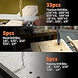 【All-In-One Convenience 】 Comprehensive, high quality 350pcs drill bits and driver set, Ideal for DIY projects and household maintenance and repair. Variety of drill bits set for wood, metal, concrete, masonry drilling as well as multiple driving and fastening applications. 【Master Wood, Masonry & Metal】This wood drill bit set includes 5 three-point bits for clean woodworking and 5 masonry bits for concrete and brick. The 33-piece 135° titanium coated drill bits offer superior durability and faster drilling in metal. It's the ultimate drill bits sets combo kit for multi-material applications. 【192 Ultimate Bits for Every Screw】Our comprehensive drill and driver bit set features 152 standard 1-inch bits, 40 security bits (Torx, Spanner, Tri-wing), and 50 extended 2-inch bits for hard-to-reach areas. This complete bit set for drill handles Phillips, Pozi, Slotted, Square, Hex, and Star screws with absolute precision. 【More Than Just Bits: Sockets, Hex Keys & Hole Saws】This drill bit and driver set goes beyond drilling with 10 SAE sockets, 8 hex keys, 4 hole saws (up to 2-1/8"), and a countersink bit. It's a complete workshop in a box, making it the most versatile set of drill accessories you can own. 【Universal Compatibility & Organized Storage】 All bits for drill and accessories are firmly held in a rugged, portable case . Designed for drill drivers and impact drivers, this drill bit kit is the perfect gift for DIY enthusiasts, professional contractors, and homeowners alike. Your go-to kit for any drilling and driving challenge.