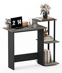- Upgrade your workspace with a small computer desk that balances modern design and practical utility. Featuring a French Oak Grey and Black two-tone finish, this desk enhances the look of any room while offering space-saving functionality for compact environments. Whether you're working from a home office or need a sleek workstation in your bedroom, this desk for bedroom delivers the perfect combination of style and structure. Its minimalist footprint makes it suitable as a small office desk, small desk for bedroom, or compact computer desk for tight spaces. Organize smarter with integrated dual shelves—use the lower level for CPU storage and the upper shelf for printers, stationery, or home decor. This smart desk with shelves layout helps declutter your surface and keep essentials within reach. Crafted from durable engineered particle board and supported by PVC tubes, this pc desk is designed to handle daily tasks while maintaining long-term reliability. The strong, steady frame remains secure on even floors, ideal for those looking for a computer desk that can hold monitors, laptops, or other devices without wobbling. At just 39.7 inches wide and 15.6 inches deep, this small desk is perfect for corner spaces, making it an excellent choice if you're in need of a small corner desk or craft table that won't overwhelm your space. Whether you're furnishing a new apartment, creating a study nook, or looking for desks for home office small space with storage, this unit fits the bill. And with quick, tool-free assembly and a clear instruction manual, setup is simple and hassle-free for all users—even those with no DIY experience. In summary, this black desk is more than just stylish furniture—it’s a practical solution for limited space, bringing together form, function, and affordability in one compact package.