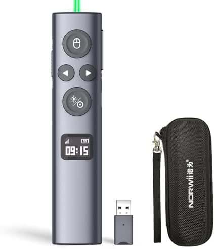 Norwii N95s BLE Presentation Clicker with Digital Pointer for PowerPoint Presentation on TV Screen and Projection Screen, Wireless Presenter Remote with Countdown Timer (Green Light-USB-A)