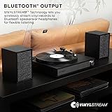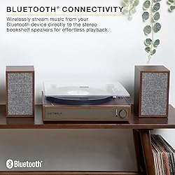 MID-CENTURY MODERN DESIGN – Full-size turntable system with matching stereo speakers, combining classic aesthetics with modern functionality PREMIUM STEREO SOUND – The included bookshelf speakers are engineered for rich, full-range audio, featuring a dedicated woofer for deep bass, a tweeter for crisp highs, and a bass port for enhanced low-end performance BLUETOOTH OUTPUT – VINYLSTREAM technology lets you wirelessly stream vinyl records to Bluetooth speakers or headphones for flexible listening AUDIO TECHNICA ATN3600L – Moving magnet cartridge delivers exceptional clarity and depth, enhancing every note of your vinyl collection played through this record player with speakers BLUETOOTH CONNECTIVITY - Enjoy seamless wireless streaming from your Bluetooth device directly to the stereo bookshelf speakers for effortless playback, enjoy clutter-free playback and sound via our turntable with speakers