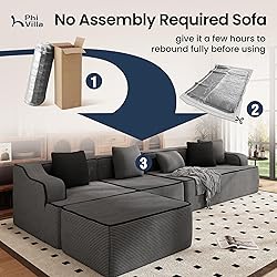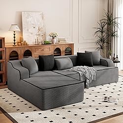 No Assembly Required: L-shaped sectional arrives with vacuum-packed for easy handling. Simply unbox, position in your living room or bedroom, and let it rebound to its plush form within 24-48 hours (no tools needed!). Separated design fits through narrow apartment doorways and adapts to small spaces. Perfect for renters, busy families, or anyone who hates DIY furniture assembly. Save hours of setup time and enjoy instant comfort Cloud-Like Comfort with Corduroy: The main material features high-resilience foam and a spring package for optimal support, while the outer cushion cover is made of durable corduroy fabric, providing an exceptionally comfortable touch. This design ensures that you remain cozy even in air-conditioned rooms, and the corduroy’s durability adds to its long-lasting appeal, making it a perfect choice that seeks both comfort and quality Modular Sectional Sofa: The separate design offers versatile choices that can be used individually or combined according to your living needs, making it ideal for various settings such as living rooms and bedrooms. Perfect for family entertainment, parent-child interaction, personal work and relaxation, and so on. The sofa also serves as a comfortable solution for accommodating overnight guests Ergonomic Design: 15.75" seat height eases sitting for all ages, and curved wider armrets bings enhanced comfort when sitting. 55.9" chaise depth fits body lounging. Non-slip silicone feet grips floors firmly, even on hardwood. Removable pillow covers adds extra convenience for daily uses Warm Tips: The sofa is shipped in 2 separate boxes, 4 square throw pillows and 1 rectangle lumbar pillow in total. Give the sofa enough time to rebound before sitting. One-year warranty and be free to get in touch with us anytime if you have any problem during the process