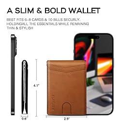 Large Capacity Wallet: Designed as a slim wallet for men, it effortlessly fits into pockets without bulk. Measuring just 4.4x3.5x0.4 inches the card holder wallet could hold 8 cards and cash securely, ideal for ever daily or travel used Advanced RFID Protection: The RUNBOX Wallet can effectively block the high frequency of 13.56 MHz, protecting your cards and personal information and ensuring that your cards won't be skimmed easily How It Works: Finally, a wallet built to streamline your daily essentials! With 2 front pockets for quick access to your most-used cards, 5 internal card slots, and a dedicated ID window, it totals 8 card slots—no more digging through cluttered compartments. Plus, we’ve added a durable stainless steel spring clip to securely hold your cash, so your bills stay neat and within easy reach Quality You Can Feel: RUNBOX men's wallets use the finest vegan leathers for sleek designs. This compact wallet, with on-trend patterns and clean lines, fits easily in your pocket and is sure to impress discerning men Perfect Gifts for him: Our minimalist wallets packed with a pretty box, this mens slim wallet is a great present for boyfriend, brother, son, husband, dad, or your male friends on christmas, birthdays, anniversaries, and fathers Day