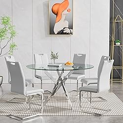 【Modern Glass Dining Table Set】: 7-Piece kitchen dining table set include 1 glass dining table, and 6 dining chairs, which makes it perfectly sized for a dinette, kitchen, or any dining area. With a modern design and elegant shape, whether you want to enjoy dinner with your family at the dining table or gather with friends, this dining table set will be a good choice. 【47.2" Glass Dining Table】: This stylish Glass dining table is perfect for bringing an air of modern style to your kitchen or dining room. Dining table is made of top quality tempered safety glass and rust proof perfect combination, which is exceedingly stable, durable and beautiful, and the exquisite craftsmanship also adds to its spectacular classic retro style. 【Round Dining Table and Chairs Set】:This round glass dining table constructed with sturdy nest X-Shaped Metal legs and tempered glass table top. The backrest and cushion of this living room chair is made of soft and springy leather, The backrest adopts an ergonomic design, which can support your back to ensure comfort without feeling back pains when sitting for a long time. 【 Premium Customer Service】: Multiple packages might not arrive at the same time, Please be patient to wait for your dining table set. If you find the product are damaged or have any problems, Feel free to contact us first by amazon message centre, we will provide free replacement. 【Quick Assembly】: Installation of this dining table set is simple and fast by following the instructions, which can be finish in just 15-25 minutes. The smooth surface can be cleaned with a towel ot cloth, so the daily maintenance needs less time and effort.