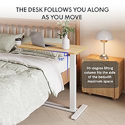 - This height adjustable versatile snack end tablemeeting diverse needs. It serves as a bedside desk, overbed table, hospital bed table, laptop workstation, portable notebook tablet stand, sofa side table, over-couch tray, chairside table, dinner tray, or TV tray for dining. Additionally, it functions as a mobile end table for coffee beside the couch.Equipped with four 360° swivel rolling wheels, including two lockable ones, the table effortlessly slides under sofas, couches, or beds, ensuring smooth mobility throughout your space. Crafted from durable board and premium metal frames, the adjustable c-table with wheels ensures exceptional stability and safety. Its arc angle tabletop design enhances safety, while the smooth, waterproof surface allows for easy cleaning.