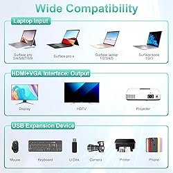 💻【11-IN-1 Surface Docking Station】The surface dock station uses surface connection technology, multi-functional MS Surface Dock instantly transforms your Surface device into a desktop PC. Keep your desktop tidy. 11-in-1 Dual display Microsoft surface Pro dock equips with 4K@60HZ HDMI ports, 1080P@60Hz VGA port, Gigabit RJ45 port, 2x USB C Data port, USB 3.0 Ports, 2x USB 2.0 Ports, SD/TF Micro SD card slot, 60W DC Power Supply. Microsoft Surface Dock 2 was built to boost your productivity. 📽️【4K@60HZ HDMI adapter for Surface Dock】MS surface pro docking station dual monitor(HDMI+VGA) support Extend Or Mirror Mode. MS Surface Pro Dock connect up to two monitors and enjoy stunning visuals and crystal-clear display quality that will elevate your work and entertainment experience. 4K HDMI support resolutions up to 3840 x 2160@60Hz. VGA port supports display resolutions up to 1920 x 1080@60Hz. ❤️Note: All resolution will be 1080P@60HZ if VGA is connected. ⚡【Ultra-High Speed Data Transfer & Memory Card Reader】Our Surface Pro hub multiport adapter offers USB 3.0 and 2 USB C ports for fast transmission up to 5Gbps. It takes only a few seconds to transfer photos or videos to your laptop. Also with 2 USB 2.0 and TF/SD Card Reader data transfer up to 480Mbps. Perfect for connecting the USB peripherals such as flash drive, hard drive, keyboard, mouse, printer and more. ⚡【Ethernet Port & 60W Power Supply】Microsoft surface laptop docking station offers full 10/100Mbps over RJ45 Ethernet port, which can download movies quicker, transfer files faster, and reduce latency, Surface pro 10 dock ensure your network connection more stable. MS Surface Pro Docking Station features with 60W power supply adapter, enjoy faster charging speed and improve your office efficiency. 💻【Plug & Play for Surface Device】The surface docking station equipped with Surface Connection technology, comes with magnetic surface connect cable. Transform your surface into a desktop PC by plugging in your dock with the surface connect cable. Compatible with Microsoft Surface Pro 11/10/9/8/X/7/6/5/4/3/2017, Surface Laptop 6/5/4/3/2/1, Surface Laptop Go 3/2/1, Surface Book 3/2/1. ❤️Note: Please connect the magnetic surface connection in the right direction to your surface and connect the power supply port when using. ❤️【What You Will Get 】1x Microsoft Surface Dock, 1x 60W Power Supply Adapter, 1x instruction manual. Buy our 11 IN 1 Versatile Microsoft Surface Dock, you will also get 24-month hassle-free manufacturer's warranty/free lifetime technical & money back in 3 months. We responsive customer service will ensure the long-time enjoyment of your purchase.