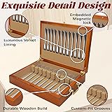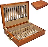 【Elegance Meets Functionality】Elevate your silverware storage with this beautifully crafted wooden box, designed to combine timeless elegance with practical functionality. Featuring a polished mahogany finish, a plush velvet interior, and an intelligent layout, this storage box keeps your flatware organized, protected, and ready for any occasion. (Note: Flatware not included.) 【Secure & Organized Storage】Say goodbye to cluttered drawers! This storage box boasts custom-fit grooves that securely hold flatware of various sizes, accommodating utensils up to 10 inches in length. Each slot is precision-designed to keep your forks, knives, and spoons neatly in place, preventing movement or scratches during storage. It can storage up to 15 sets of flatwares 【Luxurious Velvet Lining】The interior is lined with luxurious red velvet, providing a soft and protective cushion for your silverware. This premium lining not only prevents scratches and tarnish but also adds a sophisticated touch, making the box a standout piece in your home 【Portable Gold Handles】Hosting a dinner party or setting the table? The gold-tone handles on both sides make this storage box effortlessly portable. Move it between storage and dining areas with ease, all while adding a touch of class to your serving routine 【Timeless Craftsmanship】Crafted from durable, high-quality wood with a sleek finish, this silverware box blends durability with aesthetic appeal. Its classic design complements any home decor, making it a perfect addition to your dining area. Whether for personal use or as a thoughtful gift for weddings, anniversaries, or housewarmings, this storage box is a versatile and stylish choice