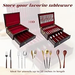 【Elegance Meets Functionality】Elevate your silverware storage with this beautifully crafted wooden box, designed to combine timeless elegance with practical functionality. Featuring a polished mahogany finish, a plush velvet interior, and an intelligent layout, this storage box keeps your flatware organized, protected, and ready for any occasion. (Note: Flatware not included.) 【Secure & Organized Storage】Say goodbye to cluttered drawers! This storage box boasts custom-fit grooves that securely hold flatware of various sizes, accommodating utensils up to 10 inches in length. Each slot is precision-designed to keep your forks, knives, and spoons neatly in place, preventing movement or scratches during storage. It can storage up to 30 sets of flatwares 【Luxurious Velvet Lining】The interior is lined with luxurious red velvet, providing a soft and protective cushion for your silverware. This premium lining not only prevents scratches and tarnish but also adds a sophisticated touch, making the box a standout piece in your home 【Portable Gold Handles】Hosting a dinner party or setting the table? The gold-tone handles on both sides make this storage box effortlessly portable. Move it between storage and dining areas with ease, all while adding a touch of class to your serving routine 【Timeless Craftsmanship】Crafted from durable, high-quality wood with a sleek finish, this silverware box blends durability with aesthetic appeal. Its classic design complements any home decor, making it a perfect addition to your dining area. Whether for personal use or as a thoughtful gift for weddings, anniversaries, or housewarmings, this storage box is a versatile and stylish choice