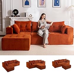 L Shaped Modular Sofa Couch: This sectional sofa couch allows you to build your own layout. Each module is individually moulded and can be split or combined at will, making it easy to cope with changes in space. Whether it's a compact flat or an open-plan living room, the layout can be adapted to utilise the space, which is convenient for you to read books, play games, watch TV and other leisure activities No Assembly Required: The tufted sofa couch is divided into 2 packages, may not arrive at the same time. Please be patient and wait for all your packages. No assembly required, after opening the package, place it in a ventilated and dry environment, wait for about 12 hours or so to be able to return to its original shape, meanwhile, gently pat each part to improve its elasticity and luster, you can enjoy a comfortable experience! Handy Cup Holder & Side Pockets: The embedded cup holder design at the armrest makes it easy to hold a drink at your fingertips, so you don't need to leave your seat when watching a film or reading a book. Side invisible storage pockets cleverly integrate practical functions, can store magazines, remote control, eye masks, etc., always keep the space neat and orderly Soft Corded Fabric: Upholstered in premium corded fabric, the sofa surface is soft, breathable and skin-friendly. It brings serene warmth, offering soft comfort. Its ribbed texture adds depth and modern style, making it a cozy focal point in any living room or lounge space High-resilience Filling: The cloud sectional couch is filled with high-density elastic filling inside, providing good support and enjoying a cloud-like comfortable sitting experience. Backrests and pillows provide lumbar and neck support, relaxing your body and experiencing a relaxing rest time. The handmade tufted button craft highlights a light luxury texture and embodies the aesthetic of home comfort