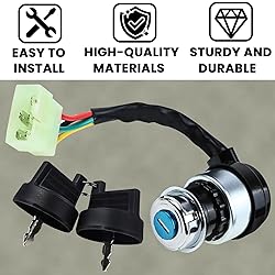 【Material】: Mainly made of plastic and metal,rust proof, stable performance, and can be used for a long time. 【Fit of】: Dune Buggy ATV Go Kart 50CC 70CC 90CC 110CC 125CC 150CC 200CC 250CC. 【Feature】: Provide good and safe conductivity to ensure the safe operation of your motorcycle, etc. 【Note】: To ensure proper installation and use, please confirm before purchasing your model matches the product. 【Package include】: 1 x Ignition switch, 2 x Key.