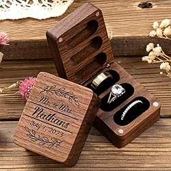 Customized Keepsake: This ring box is not just a container; it’s a personalized keepsake that captures the essence of your special day. With the ability to customize with names and dates, it becomes a timeless memento of love. The intricate engravings and the warmth of the woodwork reflect a story that’s uniquely yours, making it a cherished artifact that celebrates your union Distinctive Design: Break away from the commonplace with a ring box that’s as unique as your relationship. The 9 novel designs stand out with their blend of modern aesthetics and classic elegance. It’s a statement piece that says you value originality and style, ensuring that your ring box is as memorable as the commitment it symbolizes Exquisite Craftsmanship: Expertly crafted with attention to detail, this ring box is a testament to quality craftsmanship. The rich textures of the wood, the precision of the engravings, and the soft interior cushioning for your rings all speak to a standard of excellence. This is a piece designed to last, just like the love it’s meant to hold Intimate Experience: Every aspect of this ring box is designed to create an intimate experience. From the moment you open it to reveal the rings to the gentle touch of the engraved names and dates, it’s an experience that’s both personal and profound. This ring box is a bridge between two hearts, a private sanctuary for your symbols of love Exclusive Elegance: Step into a realm of exclusive elegance with a ring box that’s crafted just for you. The personalized details, the unique design, and the quality materials all come together to provide an unparalleled experience. It’s more than a box; it’s a journey into a world where every detail is a tribute to your love story
