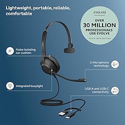 UNINTERRUPTED CALLS: With our Evolve2 30 SE wired single-ear headset, you’ll experience flawless call performance, thanks to advanced 2-microphone technology that ensures your voice is always heard clearly. IMMERSIVE SOUND QUALITY: With 28mm speakers, these wired headphones will elevate your audio experience with exceptional sound; Hear every call and song truly come to life. EFFORTLESS TEAM COLLABORATION: Works with all online meeting platforms, this Jabra headset ensures seamless communication for smooth and efficient teamwork. STAY FOCUSED, STAY PRODUCTIVE: Superior noise isolation keeps distractions to a minimum; Stay focused and productive throughout your workday with these noise isolating headphones. QUICK AND EASY CONNECTIVITY: The newest version of these headphones comes with a new all-in-one USB-A and USB-C cable for easy connectivity to most desktops or laptops.