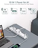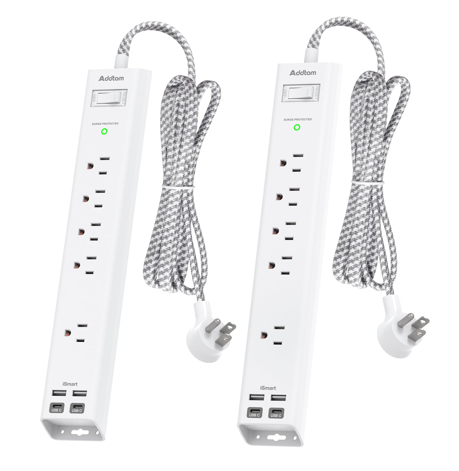 【Ultra Flat Plug Power Strip & 10 Ft Flat Extension Cord】With only 0.35 inch ultra thin plug and 45 degree right angle design, Addtam low profile flat wall plug is mush slimmer than traditional plugs, can close to the wall easily and hide in the back of furniture, bed or refrigerator, no waste for outlet and space. 10 ft extension cord with only 3mm thicker which is made of pure copper, which has better current carrying capacity (15A). Note: Total cable length: 10FT (includes flat plug + concealed portion within product housing). Externally visible cable measures less than stated length. 【10-in-1 Extension Cord with Multiple Outlets】Flat power strip could turn 1 sockets into 6 AC outlets 2 USB-A and 2 USB-C, which could charge up to 9 devices at the same time. The USB C port can charge up to 5V/3A. USB-A ports can charge up to 5V/2.4A Max, all USB Ports Output is 5V/4.5A, compatible with your cellphone, laptop, tablet, earphone or cameras without a variety of converters. 【2 USB- C Fast & Smart Charge】- Added extra 2 USB C ports for your devices, the power strip with USB C ports can charge up to 5V/3A. USB-A ports can charge up to 5V/2.4A Max. With smart charging technology, the outlet extender can auto-detects your devices and reach faster charging efficiency, perfectly fit for your iphone, ipad, tablet, bluetooth earphone etc. 【Easy Mount on Wall and Desk 】- Mountable power strip with unique screw fixation design on both end, allow this white compact extension cord securely installed in various applications (4 screws included). It is easy for mounting to walls, desks or furniture. Keep your desktop organized. The low profile extension cord also can be stable on your desktop or nightstand without slipping off, the flat extension cord makes it lighter than ordinary power strip. 【Multi Safety Protection with ON/OFF Switch】- This power strip has surge protection (900J), overload protection, short-circuit protection, over-current protection, short-circuit protection to help keep your devices safe. The on/ off switch can automatically shut off when the power exceeds rated value, to protect your expensive devices like computers, TV etc. ETL safety certified, with extension cord and other major components certified by UL.