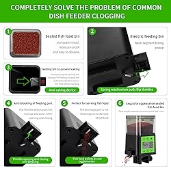 【320ML Large Capacity Automatic Feeder】 Upgraded heightened food tank, can automatically and continuously provide your fish with fresh food for 3 ~ 6 months, you don't need to worry about your pet's feeding anymore. Transparent food tank facilitates us to monitor food consumption and add food in time 【8H/12H/24H Timer & Manual Mode】 Programmable to automatically dispense set portions of food every 8 hours, 12 hours, or 24 hours, making feedings convenient for everyday use or vacations. You can also feed manually at any time, enjoy manual feeding occasionally 【Moisture-proof & Anti-blocking Design】 FISHKEEPER vacation fish feeder uses a spring device for drawer push-pull feeding. After each feeding, the bin will automatically slide back tightly to prevent food from getting wet and caking, and the rubber curtain will clean blocked food to prevent outlet blocking 【3 Sizes Precise Feeding & 3 Fixing Methods】 This food dispenser for fish tank has 3 different sizes of fish food dischargers, portion sizes can be adjusted to suit the different needs of fish/turtle/koi/goldfish/betta. 3 Installation methods fit for various types of tanks 【Premium Material & Ultra-quiet Opration】 The auto fish feeder is made of high-quality material in a matte black finish, pretty, durable, and scratch-resistant. Less than 5dB when feeding and 0dB when on standby