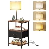 Nightstand with Lamp: Fixwal nightstand with lamps attached, featuring a 3-color temperature 9w bulb, adds vintage charm to your bedroom and prevents it from feeling monotonous. The linen lampshade and warm light create a cozy reading nook that perfectly complements your furniture. End Table with Charging Station: This bedside table features 1 U-S-B port, 2 outlets, and 1 Type-c port for charging phones, tablets, or lamps all within arm's reach. Never struggle with outlet shortages again. Keep devices powered overnight and wake up to a fully charged, clutter-free space. Safety & Sturdy Bedside Table: Built with sturdy P2 particle board, a heavy-duty metal frame, soft fabric drawers, and 4 adjustable legs with non-slip pads. The scratch-resistant PU finish ensures easy cleaning. Adjustable Fabric Drawer: The fabric drawer offers two installation positions, allowing you to customize storage height for items of different sizes. This bedside table provides ample space to organize everything from books and electronics to daily essentials. Easy to Install: The bedside table with 3 color lights includes clear instructions, provided tools, and numbered parts, making assembly simple.