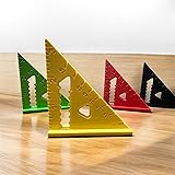 VERSATILE DESIGN: Set of 2 or 4 colorful triangular rulers in black, green, yellow, and red for carpentry and construction projects PRECISE MEASUREMENTS: 3-inch square rulers feature clear markings for accurate 90-degree angle measurements and layout work DURABLE CONSTRUCTION: Made from sturdy material suitable for repeated use in woodworking and construction applications EASY TO USE: Convenient size and clear markings make these squares perfect for quick measurements and angle checks PRACTICAL FEATURES: Built-in notches and measurement markings along edges allow for versatile marking and measuring capabilities