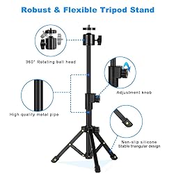 Multifunctional Tabletop Tripod: The small tripod for camera is equipped with a 1/4" ball head, which can be used for webcams, ring lights, DSLR cameras, camcorders, action cameras, smart phones, projector, spotting scope, prompter etc. Suitable for beauty shooting, live broadcast work, interviews, etc Adjustable Height and Angle: The height can be adjusted from 10" to 15.5". You can adjust the height of the webcam tripod according to your own shooting needs. The desktop tripod head ball joint allows for 360 degree rotation and up to a 90 degree tilt for multi-angle adjustment, and this design helps you to easily adjust the equipment without disassembly Stable Triangle Design: For logitech webcam tripod stand is made of high quality iron and ABS plastics and designed with non-slip rubber pads to ensure the tripod remains stable, offer maximum stability for your devices avoiding annoying bouncing while filming or surfing and protects your valuable device from tipping over Universal Compatibility. The webcam tripod for desk fits for most digital devices with 1/4 inch mounting holes, like webcams, Gopros, small cameras, ring light, projectors, camcorders. In addition, package also includes a phone clip for all 4-6.5" smartphones. You can mount a smartphone or other device for multiple shooting needs. It is a great gift choice Lightweight & Compact: Weighing in at just 260g/0.57lb. With a foldable height of 9.8 inch, the web cam tripod stand is easy to carry. The maximum load of this desk tripod is 1.5 kg/3.2lb Package includes: 1 x Desk Tripod, 1 x Phone Holder, 1 x Rotation Platform, the universal Tripod for Webcam is not intended for overly heavy camera setups; please use caution when utilizing larger devices or rigs