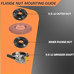[ Universal Adjustable Angle Grinder Wrench & Nut Kit] Solve the problem of lost or missing wrenches. This versatile set includes 1 adjustable wrench that fits major brands like DeWalt, Milwaukee, and Makita, plus 4 replacement flange nuts (2 inner, 2 outer).. Perfect for DIY, workshops, and professional grinder parts replacement. [5/8"-11 Universal Compatibility] Fits 4.5"/5"/7" angle grinders with 5/8"-11 threaded shafts. Compatible with Dewalt, Milwaukee, Makita, Ryobi, Bosch, Metabo and more. Include models Dewalt DWE402/DCG412/D28402, Milwaukee M18 2980-20, and Makita 9005B/9015DB/9557NB, etc. Note: Please verify shaft is 5/8"-11 threaded and protrusion-free before ordering. [Carbon Steel Flange Lock Nuts & Pin Spanner Wrench] Made of high quality hard carbon steel, more durable, wear resistance. It has good heat dissipation, which is beneficial to prolong grinder wrench and arbor nut life. [ Easy Grinder Nut Replacement] Increase grinder performance with our angle grinder nut and washer Kit. Beginner-friendly Installation: Loosen old locking nuts with the included adjustable wrench→ align new flange lock nuts→ tighten securely. No Extra Tools Needed! [Cost-Effective All-in-One Solution] This universal wrench and nut kit is an essential angle grinder attachment that saves you from buying multiple brand-specific parts. We stand by our quality with hassle-free support.