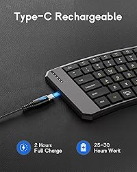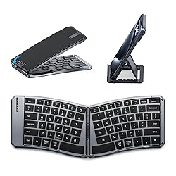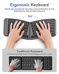 Ergonomic Foldable Keyboard: Feeling discomfort in your wrists and shoulders after typing on a traditional keyboard for a long time? Try our ergonomic keyboard! It changes the traditional rectangular arrangement to a curved one, allowing your hands to rest naturally on the keys for a more comfortable typing experience. Connection Modes and Wide Compatibility: Foldable keyboard supports Bluetooth connection and 2.4G wireless connection (2.4G USB receiver included). The connection distance is 10-15 m, stable and uninterrupted. The folding keyboard can connect 3 Bluetooth devices at the same time and easily switch between devices. Compatible with iOS, Android, Windows and Mac OS, it works perfectly with tablets, phones, laptops or PCs. Ideal for multi-device office users. Rechargeable Battery: The Bluetooth ergonomic keyboard has a built-in 140mAh battery and is charged by a USB-C cable. A full charge takes about 2 hours. When fully charged, it can work for 25-30 hours. The wireless keyboard auto sleeps after 10 minutes of inactivity, which can effectively extend the overall battery life. Excellent Use Experience: MoKo foldable wireless keyboard has a locking clasp on the back, allowing the keyboard to work on your lap without folding up easily. The Bluetooth keyboard base is designed with PU leather non-slip pad, so it will not move around even when working on a smooth desktop. The keys adopt a scissor mechanism for noiseless typing, providing you with an immersive office experience. Compact and Portable: Innovative foldable design allows the keyboard to easily fit into a backpack, computer bag or tablet sleeve case. Its folded size is 7.09×4.92×1.5 in/18×12.5×3.8 cm and expanded size is 14.09×4.92×0.75 in/35.8×12.5×1.9 cm. This portable Bluetooth keyboard is perfect for school, business trips and traveling. Ideal for use on airplanes, in libraries, coffee shops, or anywhere.