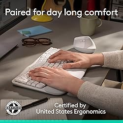 Feel the Wave. Feel the Lift: Wave Keys ergonomic wireless keyboard and Lift vertical ergonomic mouse are matched to turn your desk life into a feel-good story Type comfortably all day: This compact keyboard’s wavy design supports natural hand, wrist, and forearm alignment, while the plunger key switches deliver a tactile, discreet, and satisfying typing experience More palm support, less strain: This ergonomic Bluetooth keyboard features a cushioned memory foam palm rest, providing all-day comfort and enhanced wrist support (1) Raise your hand into comfort: Small to medium hands feel great on Lift wireless vertical mouse, with a softly textured grip and snug thumb rest 57° of sooooothe: Lift’s vertical shape takes the pressure off your wrist, and promotes a more natural posture in the forearm for day-long comfort and productivity Alt for transcreation: ‘optimal 57° vertical angle’ Relax into focus: Customize your workflow with the Logi Options+ app and enjoy whisper-quiet clicks plus a SmartWheel that seamlessly adjusts scrolling speed to match the pace of your flicks Ergo-certified: Wave keys and Lift have been designed, tested and approved according to criteria set out by leading ergonomists Plastic parts in Wave Keys and Lift (off-white) include certified post-consumer recycled plastic (Keyboard: 46%(5), Mouse: 54%(5)).
