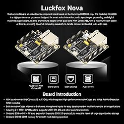 Powerful Processing: Equipped with a 64-bit quad-core ARM Cortex-A35 at 1.3GHz, the Luckfox Nova board offers robust performance for complex embedded tasks and multimedia applications. Integrated Audio Features: Includes a high-performance Audio Codec with Voice Activity Detection (VAD) modules, supporting up to 8-channel microphone inputs for advanced audio and voice applications. Flexible Peripheral Support: The board features 2 × 26PIN GPIO headers and supports various communication protocols, including UART, SPI, and I2C, enabling easy integration with external devices. Expanded Storage: Onboard 8GB eMMC and TF card expansion (SDIO 3.0 support) provide ample storage capacity for data-heavy applications and media files. Smooth Multi-tasking: With 512MB DDR3 memory, the Luckfox Nova ensures smooth, efficient multi-tasking, making it ideal for embedded systems requiring reliable performance. Rich WiKi Resources: We provide official Wiki resources, please visit our store and click the wiki page to get resources.