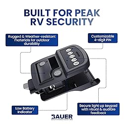 TECHNOLOGY LEADER: The BAUER NE Bluetooth Keyless Entry Door Lock with Handle is an essential RV accessory, offering ultimate security with advanced close field technology and durable construction. FITS VARIETY OF TRAILERS: This RV keyless entry door lock is a camper must-have, providing a secure and convenient solution for your trailer lock needs with its innovative design and reliable performance. Our handle fits most standard cut outs measuring 3.75" x 2.75" x 1.5". PACKED WITH FEATURES: Enhance your RV essentials with this durable RV door latch, featuring AI Sentis HSS Keypad Technology, Lock & Unlock History tracking, smartphone and smartwatch applications, and more! BUILT STRONG: Designed for modern campers, this RV door lock with handle combines style and functionality, making it a perfect addition to your trailer accessories collection. Experience the convenience of a keyless entry door lock with handle, a vital component of your camper accessories, ensuring your RV door handle is both secure and user-friendly.