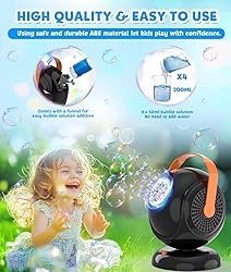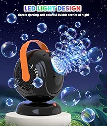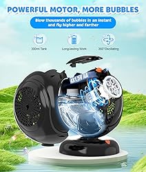 Multi-Angle Bubble Blowing - The Joyfuture bubble machine can be adjusted 75° up and down to blow and run to direct the bubbles as needed. Simply press the switch on the base and it will start oscillate 360°, ensuring that the bubbles cover the entire yard, party, etc. Efficient Bubble Blowing - Equipped with a powerful motor, it can blow thousands of bubbles per minute. Create a romantic atmosphere of bubbles, and children run around, eyes wide with excitement, as the sea of bubbles fills the air. The design of LED lights adds a touch of magic and charm to these glowing bubbles at evening parties or outdoor night activities. Ideal Gift for Kids Ages 3 and Up - This bubble machine is more than just a toy, it is an ideal gift for children on all occasions. Whether it is a birthday, Easter or Halloween, it is sure to bring joy and laughter and create unforgettable memories for little ones. Laughs Off Splashes - Built-in 300ml solution storage compartment, sealed to ensure leakproof. Lightweight at 2 pounds, it can be carried in one hand. Whether it's a picnic in the park, a beach party, or a backyard camping trip—grab it and go! It'll rock the place in 10 seconds! Engineered for Worry-Free Play! - Using high-quality and durable ABS material prevents it from being damaged when dropped. The surface is smooth and burr-free, ASTM F963 certified, friendly and safe to children's skin. Safety Test: Meets the safety standards of CPSC, EU, CA. WHAT IN BOX: The set includes 1 bubble machine, 4 bottles of bubble solution *50ml, 6*AA batteries and 1 funnel(for solution). Hassle-Free Support Promise - Your Satisfaction Guaranteed! Got issues? Message us first! Free replacements/refunds. We respond in <12h. "We’ll make it right – no questions asked!"
