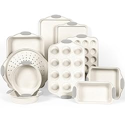 - Strong & Durable: Built with 0.5 mm thick carbon steel, our baking pan set offers outstanding strength, stability, and long-term durability. Designed to withstand temperatures up to 450°F without warping. Versatile Set: This 10-piece bakeware set has everything you need for baking, roasting, and meal prep. It includes: small cookie sheet (15.55×10.24×0.79 in), large cookie sheet (17.72×11.3×0.79 in), pizza pan (14.76×12.99×0.79 in), baking pan (17.72×11.3×1.57 in), loaf pan (11.81×5.91×2.36 in), square cake pan (11.02×8.86×1.97 in), 2 round cake pans (10.12×8.66×1.97 in), 12-cup muffin pan (16.34×10.43×1.3 in), and 24-cup muffin pan (17.13×10.16×1.06 in). Ideal for beginners and pros alike. Toxin-Free Nonstick Coating: Each pan features a high-quality nonstick coating that ensures effortless food release and easy cleanup. Made without PFOA, PTFE, BPA, or lead, our bakeware guarantees a safer baking environment for you and your family.Heatproof Silicone Handles: Designed with cream-colored silicone handles, our bakeware offers enhanced grip and comfort while helping to prevent accidental burns. Whether you're pulling pans out of the oven or transferring them to the counter, you'll appreciate the secure and safe handling.Stackable Design: The space-saving, stackable structure allows for organized and compact storage, making this set ideal for any kitchen. Compatible with standard and convection ovens, it also works perfectly in refrigerators and freezers. Perfect for birthday, Christmas, thank you gift, Mother's Day, housewarmings, or weddings.Easy to Clean & Worry-Free Guaratee: Stain-resistant, easy to clean & dishwasher safe but hand washing is recommended to extend pan life. Not satisfied? No problem — we’ll refund or replace it, no questions asked.