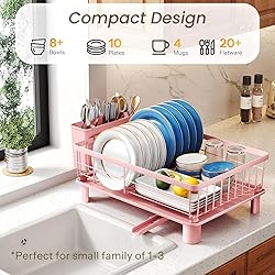 SNTD Dish Drying Rack - Small Dish Rack for Kitchen Counter, Stainless Steel Dish Drainer with Utensil Holder and Drainboard, 11" W x 15" L (Pink)