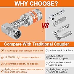 - High-Efficiency Suite - This Grease Gun Accessory Kit includes everything needed for streamlined greasing: 90° Grease Coupler Adapter, Grease Needle Dispenser, Grease Needle Nozzles, and Cleaning Tool. No matter the situation you face, there's always a purpose-built accessory to resolve your challenge Wide Application - Each adapter offers specialized functions, expertly engineered for lubrication in confined spaces, hard-to-reach areas, and heavy machinery. Ideal for automotive maintenance, agricultural equipment, industrial systems, and truck servicing User Friendly Operation - The 90° elbow adapter supports lateral/vertical oiling, ensuring easy lubrication where straight couplers fail. the needle tips can access extremely narrow openings, and the cleaning cap is designed to quickly remove residual grease from the nozzle in just 3 seconds Quick-Connect & High-Pressure Lock - Upgraded 90° adapter features an innovative four-jaw connector with threaded collar. Simply ROTATE the collar for a fast, secure connection and instant release, even under extreme pressure up to 12,000 PSI Storage & Maintenance - Grease fittings are housed in high-hardness plastic cases with custom-cut foam inserts. This design secures fittings, prevents friction damage, and maintains organized storage through quick-access compartments High Quality - Crafted from nickel-plated alloy steel, the adapter end features a grease fitting interface that seamlessly integrates with your existing traditional or quick-connect grease fittings. You can quickly swap grease gun nozzles based on your needs, making lubrication operations more convenient