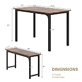 【Multifunctional 3 Piece Dinning Table Set】Multifunctional 3-Piece Dining Table Set: Perfect for family meals, this space-saving set comfortably seats 2-4 people. It includes a rectangular table (43" x 28" x 30") and two benches (38" x 11" x 18"). Beyond dining, the versatile table easily doubles as a computer desk, workstation, or writing table. 【Space-saving Design for Small Spaces】The benches' reasonable size allows it being put under the table without the risk of tripping over while preparing the meal. At the same time, this design can also save space for other items, making it an ideal choice for small spaces, such as small apartments, kitchens, offices, etc. 【Industrial Design Adapt to Various Decor Style】With classic wood finishes and smooth lines, this dining table and bench set creates an industrial feel, giving your room an elegant and retro look that complements any style of home decor. Thus, it is suitable for cafe, tavern and restaurants. 【Heavy Duty Frame for High Stability】The frame is made up of reinforced iron pipes to ensure overall robustness and support long-term use. And the tables and chairs can respectively hold 200 lbs and 661 lbs. Besides, each legs are equipped with adjustable feet pads to protect the floor from scratches. 【Easy to Maintain & Install】 This 3-piece dining table is waterproof, scratch-resistant and easy to clean. And the dining room table set comes with a clear assemble instruction. With the help of it, you can quickly finish the installation without any additional tools.