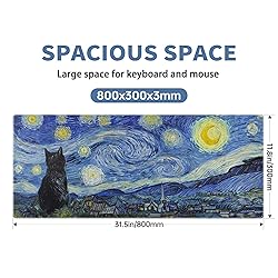 ✅Large Size: This Large Mouse Pad Is 31.5 X 11.8 In (80 Cm X 30 Cm), Offering A Wide Area For Keyboards And Mouse To Move Around. This Extended Gaming Mousepad Xl Keyboard Mat Desk Mat Fits Different Gaming Desktops, You Can Also Use It As Desktop Or Platform Protector.Exquisite Van Gogh's Starry Night cat mouse pad patterns give you a better experience. ✅Durable Material: Gaming Mouse Pad Is Thick And Feels Soft In The Hand , Which Can Help To Muffling Noise When You Type On The Pads Heavily. Our 3 Mm Thick Full Desk Mat Mouse Pad Gives Your Hands Ease And Made Of High Quality Material Which Offers Comfortable Gaming Or Working. ✅Waterproof And Easy To Clean: This Gaming Mouse Pad For Desk, Spill-Proof Coating Protects Your Desktop From Spilled Water, Drinks, Ink And The Other Liquid Spilled Liquid Or Other Accidents. Easy To Clean, Just Wipe With Wet Cloth Or Paper, Does Not Fade And Can Be Washed And Foldable Without Leaving Creases, Easy To Carry. Desk Mat Provides A Protective, Waterproof, Colorful Surface For Your Home Office Desk. ✅Non-Slip Rubber Base: The Gaming Mouse Pad Is Designed With High-Density Textured Rubber, And The Dense Non-Slip Shading Can Firmly Grasp The Desktop, Avoid Random Movement, And Provide Stable Operation For Your Mouse/Keyboard. ✅Great Choice: A Great Desk Organizer To Keep Your Desktop Clean, And Also A Beautiful Desk Decoration As A Desk Protector. Use A Wet Cloth Or Throw It In The Washing Machine And Let It Hang Dry. ✅Friendly Customer Service: If you have any issues with our gaming mouse pad,please let us know. Our service team are always here and ready to help you at any time.