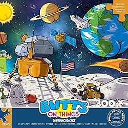 • Sit your butt down and get puzzling! This 300 Oversized piece 24 x 18 inch interlocking jigsaw puzzle for ages 14+ from illustrator Brian Cook features one of his popular "Butts on Things" illustrations, presenting familiar objects with, uh, unexpected anatomical features. This one features Earth as seen from the moon with a lunar lander, satellites, planets and more. A bonus poster is included. Count on Ceaco for the most Creative, Exciting, and Colorful puzzles since 1987.
