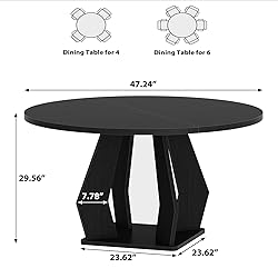 【Dining Delight】The 47 inch round dining table comfortably accommodates 4-6 people, fostering a warm and inclusive dining atmosphere. From intimate family dinners to lively festive friends' gatherings, its spacious circular shape promotes effortless conversation and interaction, helping to bring people closer together and to create memorable and enjoyable moments. 【Superior Quality】Crafted from premium MDF material, this round kitchen table ensures exceptional stability, durability, and resistance against heat, scratches, and moisture. Its square base and robust wood legs unite for superior load-bearing capacity and unwavering balance. Even under frequent use, this black dining table remains a steadfast centerpiece in your dining space for years to come. 【Modern Design】The black four-piece irregular grain veneer of this dining table is a visual delight.Its sleek silhouette and clean lines add a modern, minimalist aesthetic that seamlessly adapts to diverse home styles. By fostering a warm and conversation-friendly dining atmosphere, it transforms every meal into a pleasurable experience. 【Versatile Functionality】Beyond dining, this glossy round dining table serves as a dynamic social hub—hosting game nights, casual chats, and even remote office work. Its seamless circular design effortlessly adapts to diverse spaces: dining rooms, kitchens, living room, cafés, or lounges. 【Easy Assembly】Each round wood dining table comes with easy-to-follow installation instructions and numbered accessories that make assembly easy. Note: The package includes only the table itself. A two-person installation is recommended for quick completion of the installation. If you have any questions about the product and installation, please email us and our customer support team will respond within 24 hours.