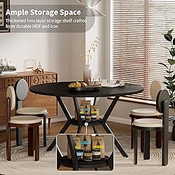 Bring Every Meal to Life: Gather around a table that brings people together. This 42-inch round dining table comfortably seats four, making it perfect for family dinners, cozy breakfasts, game nights, or festive celebrations(Thanksgiving Dinner, Christmas Home Party). Whether it’s a casual weekday meal or a special occasion, this farmhouse kitchen table becomes the heart of your home. (Package includes one table) Smart Storage Meets Sleek Design: Keep your dining area tidy and stylish with the built-in lower shelf — This space saving dining table is ideal for storing dinnerware, kitchen essentials, or decorative accents. The round shape and pedestal base maximize usable space, making the kitchen & dining room tables perfect for smaller rooms without sacrificing functionality. Durable, Stable & Everyday-Ready: Built to withstand daily use, this wood dining table features a solid X-shaped base and heavy-duty 50x25mm steel legs for enhanced stability. The thick MDF tabletop is heat-resistant, scratch-resistant, and waterproof — easy to clean and ready for anything from busy breakfasts to weekend dinner parties. Adjustable, anti-slip foot pads ensure stability on uneven floors while protecting your surfaces. Rustic Style with Industrial Edge: Elevate your interior with a perfect balance of farmhouse charm and industrial flair. The rich black wood grain finish paired with a metal base of this dining table round creates a warm, welcoming look that complements a wide range of décor styles — from classic to contemporary. Compact, Versatile & Space-Saving: Designed with a compact footprint and open leg space, this pedestal table offers ample legroom while letting chairs tuck neatly underneath. Ideal for kitchens, apartments, or multipurpose areas, this small dining table for 2-4 can easily double as a breakfast nook, coffee table, restaurant seating, or even a small meeting table. Quick Assembly & Seamless Finish: Unlike standard 4-piece tops, our upgraded 2-panel tabletop is easier to assemble and offers a cleaner, more seamless look. The custom metal connector ensures a secure fit, minimizing gaps and enhancing surface elegance. With step-by-step instructions and an easy-to-follow installation video, setup is quick and hassle-free. Need help with our farmhouse table? Our responsive customer support team is here to ensure your satisfaction.