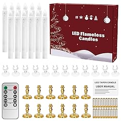 GIFT BOX EDITION INCLUDES EVERYTHING YOU NEED: Includes 1 Gift Box, 12 drip texture window candles, 12 plastic candle holders,12 suction cups, 2 AAA batteries per candle, 1 Daily Timer Remote Control,1 super easy to follow operating manual. SAFETY and EASE: The design of a 3D flame with flickering warm yellow light and drip texture design makes the candle more realistic. Decorate with these timeless Flameless LED Window Candles without worrying about the dangers of fire. Use outdoors without worrying about wind blowing them out. CANDLES CAN TURN THEMSELVES ON AND OFF EVERY DAY AUTOMATICALLY: Use the Remote to turn the candles ON and OFF or Set the TIMER and the candles will turn on every day at the same time and will run for the selected number of hours (4, 5, 6, or 8 hrs). Set it and forget it! BATTERIES INCLUDED: USE 2 AAA BATTERIES per Candle.You can set 2 light modes, flickering or normal light depen on what you need.This candle light perfect for windowsills, fireplaces, and dining tables. Warm light glow creates a romantic atmosphere when use as dinner, party, wedding, birthday, Christmas home decoration. CUSTOMER SERVICE: Kithouse cares about our Customer Satisfaction. Let us know how we can help! Tips:1.When you are not using the candle, the battery should be removed and not left attached to the candle.2.When using the remote control, the direction needs to be aligned directly towards the candle, not tilted, otherwise it may not be controllable.