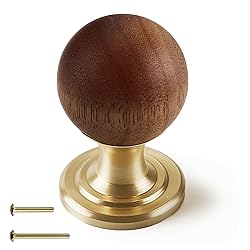 • Upgrade spaces with wood knobs featuring natural walnut spheres (15/16in/24mm) on solid brass bases, blending organic warmth with modern drawer pulls elegance. These wooden cabinet knobs deliver comfortable grip at 1-1/2in (38mm) height, perfect as drawer pulls for kitchen cabinets, dresser drawers, or vanity hardware. Each wooden knob showcases unique timber grain alongside metallic luster, creating luxe cabinet hardware for wardrobes, nightstands, and bifold doors. Includes dual screws for quick install on wooden drawer pulls, walnut cabinet pulls, and cabinet & furniture pulls projects