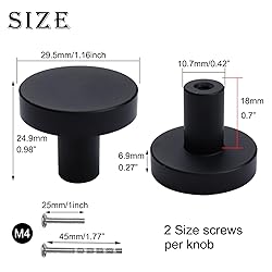 • Specification Package: 5Pcs Furniture Cabinet Knobs Material: Aluminum Alloy Color: Matte Black, Gold, 2 color for your options Size: 29.9mm / 1.177 inch (top diameter); Height: 25mm / 0.98inch; Knob Base Width: 11mm / 0.43inch; Screws: 5Pcs M4*25mm/1inch, 5Pcs M4*45mm/1.77inch Feature * High quality aluminum alloy and well package. * Dresser knobs with round design, very safety, won't hurt hands in use. * Each knobs with 2 sizes screws, enhances the convenience of the installation process. * DIY your home furniture, nice replacements for old knobs, give your cabinets a new looking! * KINDLY NOTE: Knobs surface may be slightly scratched due to friction in transit. If there are scratches, welcome to contact us to return or replace.