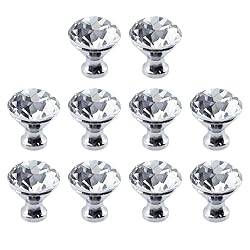 Size: Crystal pull measures 0.91"x0.94"/23x24 mm(WxH), bottom diameter is 0.59"/15 mm; Package: 10 x Crystal Pull with screws Material: This cabinet knob is made of aluminum alloy, the coated surface and rounded edges are smooth and burr-free, and the diamond crystal knob has a sturdy structure for long-term use Elegant and Stylish: These drawer handles and handles are made of crystal glass and aluminum alloy base, with a polished surface that is smooth and rounded; The appearance is a beautiful diamond shape, adding a touch of delicacy to your home decor Easy to Install: Simply find the desired location, drill a hole, drive a screw through the back of the wooden board, and tighten it onto the knob to complete the installation Wide Range of Applications: For home dressers, drawers, cabinets, bookcases, closets, kitchens, bathrooms, living rooms, dens, dormitories, and offices