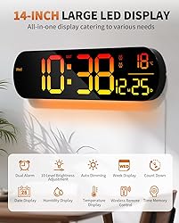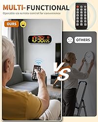- 【Convert 11 Colors Freely】14" High definition LED large screen display, the digital wall clock can change 11 colors of large digits with remote control. You can read it clearly, even in the distance or corner. ATTENTION: Must be plugged in to work. Not battery operated. 【Ambient Night Light】The bottom of the digital clock comes with 9 different color ambient lights. It can serve as a night light, giving you a warm and romantic night. It is a simple and elegant artwork that decorates your room. 【10 Levels Automatic Brightness Dimmer】With 10-level adjustable brightness display, you can easily adjust to a comfortable brightness manually by the remote control. The LED clock has a built-in automatic dimming sensor, which can also automatically adjust the brightness as the light changes, smart to provide you with the needs. 【Upgraded Memory Function】Built-in AAA battery memory function, even if the power is off, the time data will not be lost and no need to reset. (AAA batteries not included) This large wall clock has a count-up or count-down function (up to 99 minutes and 99 seconds). 【Remote Control】All the settings and operations of the big wall clock do not need to be removed, but can be easily done with the remote control. Note: If you don't find the remote control and USB cable, be sure to open the other end of the box to check it. 【Beautiful and Functional】This wall clocks is suitable for living room, kitchen, garage, farmhouse, office, warehouse, classroom, gym, shop, nursery. And it is also the best gift for friends, partner and the elderly. Attention: It needs to be plugged in to work. The battery power only works for storing the clock setting in the case of main power outage.