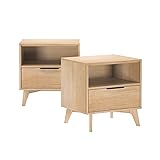 Modern Nightstand: Solid wood nightstand includes a spacious drawer and open shelf to help organize all your everyday items; Nightstand features chic neutral finishes to showcase the natural wood grain and create a modern look. Superior Quality: Bedside table with drawer is crafted with knot-free, solid pine wood and sturdy engineered wood with clean, low-VOC finishes; This wood bedside table is extra durable with a style that pairs with every room décor. Convenient Handle: Black or brass drawer pull makes it easy and convenient to open and close drawer. Easy Assembly: Bedside nightstand includes easy-to-read instructions, hardware, anti-tip kit, and all the tools you need for a quick set-up; wooden nightstand conveniently ships in one box. Total Footprint: Nightstand with drawer measures 24” L x 19” W x 25” H; Interior of drawer measures 22.5" L x 15" W x 8.25" H; Interior of shelf measures 24” L x 19” W x 8.25” H.
