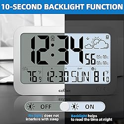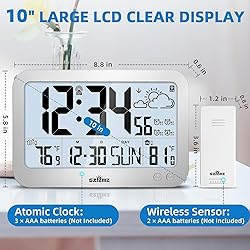 WIRELESS OUTDOOR TEMPERATURE SENSOR: The wireless outdoor sensor (included) transmits the outdoor temperature data to the Large wall clock. For optimal performance, place the sensor within 330 feet (100 meters) of the clock and keep it away from direct sunlight and rain DIGITAL WALL CLOCK OR DESK CLOCK: Jumbo 10" Height Time Digital Display, use as either a wall clock or as a desk clock, it is easy to read, use and set up. Designed for absolute simplicity, it is easy to read, use, and set up—even manual time adjustment is supported. Perfect for anywhere in your home or office ATOMIC CLOCK WITH BACKLIGHT FUNCTION: This digital clock has a backlight feature. Pressing the top button will turn on the backlight for 10 seconds. This feature helps you see the current time clearly, even at night ACCURATE ATOMIC CLOCK: The atomic clock features a built-in receiver that automatically synchronizes with WWVB broadcasts, updating the time daily without requiring additional settings to ensure accuracy. It supports 4 time zones (EST, CST, MST, PST), allowing you to select your local zone for precise timekeeping DIGITAL WALL CLOCK WITH AUTO DST: When the alarm or daylight saving time (DST) is activated, a corresponding icon will be displayed on the screen. With DST enabled, the clock will spring forward or fall back by one hour automatically during daylight saving time WALL CLOCKS BATTERY OPERATED: Atomic clock indoor outdoor thermometer is powered by 3 AA batteries (not included), the wireless outdoor sensor is powered by 2 AAA batteries (not included). Both clock and outdoor sensor are supported by batteries only, requiring no plugging in or charging