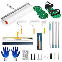 Complete Tool Set- This Self Leveling Cement Tool Kit includes all parts: 1x22in leveling rake,1x20in spiked roller,1x9in spiked roller,1x9in paint roller,1x4in paint roller,1x spray guard for spiked roller,1x adjustable 6.6ft long pole with adjustable angle connect,1x trowel,1x work gloves,1x spike shoes for epoxy flooring. Everything you need for smooth floors in one box. Efficient Surface Smoothing - Made of stainless steel,the 22 inch epoxy squeegee equiped with concrete rake blade(2mm sharp teeth on oneoneside and 3mm square teeth on the otherside) resists rust, corrosion and wear, choose as you want to ensure consistent spreading thickness. Upgraded for Better Finish - The 20 & 9 inch spike roller can quickly remove air bubbles on the floor, leaving a smooth and polished surface for your cement or epoxy floor.This epoxy floor kit includes a splash guard which works efficiently for finishing epoxy floors faster with no messy splashes. Adjustable and Expandable Design - Rocfinity garage epoxy floor kit is equipped detachable extension rods (up to 80 in/6.6 ft long) and an adjustable angle connector, it can be paired with both epoxy squeegee rake and epoxy roller,making it comfy for all distances,angles and ease you from back pain. Non-slip & No Footprints - The epoxy shoes spikes(11.6"Lx 5.1"W) are compatible with unisex US adult shoe sizes 6-11. Made of high-strength material, capable of supporting up to 200 pounds. Each cleat features 13 x 1.2in short spikes, distributed ergonomically to provide stable support,not only leave No marks but also help eliminate bubbles in the self leveling compound, allowing you to complete the job flawlessly.The spike shoes can also be used for plastic runway construction and lawn loosening. Premium Concrete Leveling Foam Kit - Our epoxy tools also come with protective work gloves to protect your hands and a serrated stainless steel trowel with sturdy wooden handle to provide perfect finish for details and a 9 in&4 in paint roller for diverse paint.All the tools are simple to assemble without effort,covering almost all the needs of self-leveling cement floor construction.