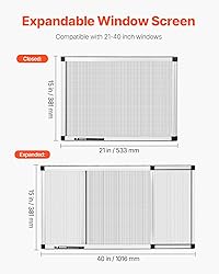 Adjustable & Versatile: The adjustable window screen size is 21 x 15 x 0.7 inches when closed, and expands to 40 x 15 x 0.7 inches to fit different window sizes. It can be flipped 90° for vertical window use, ensuring flexibility for your entire home Easy Installation: Install in just 3 simple steps with no professional tools required. One person can quickly install or detach the expandable window screen, making cleaning and moving easier while saving on repurchasing costs High Transparency Mesh Screen: Made of flame-retardant fiberglass mesh, this durable expandable screen for windows effectively blocks critters while remaining nearly invisible. It allows natural light to enter, combining functionality and appeal Rust-Proof Tracks: The heavy-duty metal tracks are not easy to rust even in humid environments. Reinforced for added strength, they provide smooth sliding with frequent use and strong pressure durability, ensuring long-lasting use Felt Edges for Better Seal: The felt edges on the top and bottom seal gaps around the window frame, keeping out unwanted critters. This design keeps water out during heavy rain, enhancing the retractable window screen's overall sealing performance