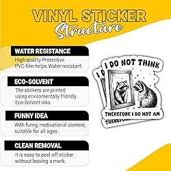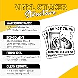- 3 Pcs I Do Not Think Therefore I Do Not Am Stickers – Funny Philosophical Quote Decals for Sarcastic Souls, Deep Thinkers – Gifts for Fans of Humor and Philosophy for Laptop, Water Bottle – 3"x3" Waterproof: Our sticker is deal for use in damp or muggy conditions because it is made to be totally waterproof. Applying it to surfaces like water bottles, car windows, and even boats can be done with confidence. UV Protection: Our outdoor stickers offer protection against UV rays from exposure to sunlight, rain, and wind, among other factors that qualify them for outdoor use. Durable: The premium vinyl used to make the stickers is intended to be weather- and scratch-resistant. It is designed to endure years in the weather. Precision die-cutting: With the use of cutting-edge die-cutting technology, your design is accurately, crisply, and cleanly cut out of our sticker. Additionally, this technology makes it simple to modify the sticker to meet your unique design requirements. Versatile: You can use our sticker on a lot of different things, such as water bottles, laptops, cars, and more. Furthermore, it is appropriate for both indoor and outdoor use due to its waterproof qualities. Easy to apply: No special tools or techniques are required to apply our sticker; it is designed to be that simple. Simply peel off the backing and apply it to any smooth surface. Furthermore, it is simple to remove the sticker without leaving any trace.