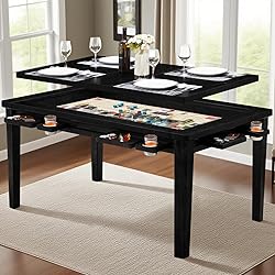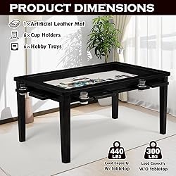 【Dual-Use Dining & Gaming Table】This board game table with removable top boasts a unique 2-in-1 design. The detachable tabletop can be easily lifted up through the grooves, revealing a dedicated gaming area. The integrated slots ensure a secure and precise fit when the panel is in place. Whether you're enjoying meals on its classic dining surface or switching effortlessly to immersive gameplay, it excels at both. 【Player-Friendly Design】Six included cup holders keep drinks secure and within reach, while six versatile hobby trays provide dedicated space for dice, cards, crafts or snacks. These accessories slide smoothly along hidden rails for easy repositioning or removal,enhancing your game nights or casual gatherings. 【Sturdy & Easy to Maintain】Crafted from solid wood with heavy-duty craftsmanship,this game table for adults surpasses standard MDF tables. It offers superior strength, substantial weight, and unique, beautiful wood grain for ample support and durability. The durable surface is also remarkably easy to clean and maintain, ensuring lasting beauty.The tabletop supports up to 440 lbs. 【Multi-Purpose Gaming & Activity Hub】Beyond its core function as a premier board game table, this versatile surface excels at numerous activities. It' s perfect for intricate puzzles, extended crafting projects, and building blocks. Plus, when covered, it even provides convenient storage for game components. It's truly a centerpiece for any game and card table enthusiast! 【Spacious for 4-6 Players】Designed for gatherings, this large D&D table (63" x 39.4" overall) features a generous recessed play area (53.7" x 30.7"), comfortably accommodating 4 to 6 adults. What’s more, its modern design complements any dining room, kitchen, game room, or living room. 【Waterproof Table Mat Included】The recessed play area comes with a soft, non-slip leatherette playmat. This water-resistant surface ensures quiet dice rolls, protects game pieces, and enhances gameplay. Assembly is effortless, with clear instructions and videos provided. Note: For safer shipping, delivery arrives in two separate boxes; please allow for possible staggered delivery.