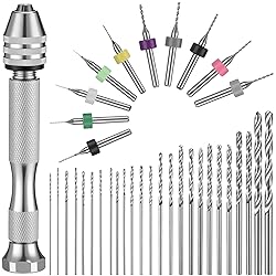 - Feature: Compact and portable: Compact size manual hand drill is good to store in a toolbox or in pocket, easy to carry and store, bring more convenience for you in daily work, suitable for electronic assembling, tooling, model making, winding, home decorating and so on. Specification: Material: Pin vise: aluminum alloy PCB mini drills: tungsten carbide Color: silver Quantity: 36 pieces Pin vise size: approx. 3.54 x 0.6 inches/ 9 x 1.4 cm Package includes: 1 x Pin vise 10 x PCB mini drills 25 x Twist drills Note: The size of 0.1-1 mm pcb drill bit is too small. It is not recommended to use it by hand. It is recommended to use electric drill or mini electric mill with fixed lathe or clamping table. Manual measurement, please allow slight errors on size. The diameter of the drill bit is small, please control the strength when using it