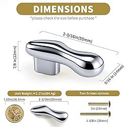 Solid Brass Elegance: These solid brass cabinet knobs feature a premium weight and long-lasting durability, ideal for kitchen cabinet knobs, drawer pulls, or dresser knobs. The Silver-Tone finish adds a luxurious accent to any cabinet hardware setup. A timeless upgrade to your Silver-Tone cabinet knobs and pulls collection Unique Teardrop Drawer Knobs: Featuring an ergonomic, flowing shape inspired by nature, these modern cabinet handles and drawer knobs blend soft curves with minimalist style. Designed to install horizontally or vertically, they perfectly fit both narrow and wide kitchen cabinets, dresser drawers, or wardrobe knobs Comfortable Size for Easy Grip: Measuring 2-1/8 inches (55mm) long and 9/16 inch (14mm) wide, these teardrop pulls are designed for effortless use. Their smooth curves fit comfortably in your hand while adding stylish flair to cabinets and drawers Wide Application: Ideal for dresser drawers, nightstands, kitchen cabinets, or sideboards. Its refined look fits seamlessly into modern, classic, or transitional interiors, making it an easy upgrade to any room Easy Installation: Each knob comes with both 1-inch and 1-3/8-inch screws for quick installation on cabinet and drawer panels approximately 13/16 inch and 1-3/8 inch thick. Mounting hardware is included for a smooth, hassle-free setup. For other thicknesses, additional screws may be needed